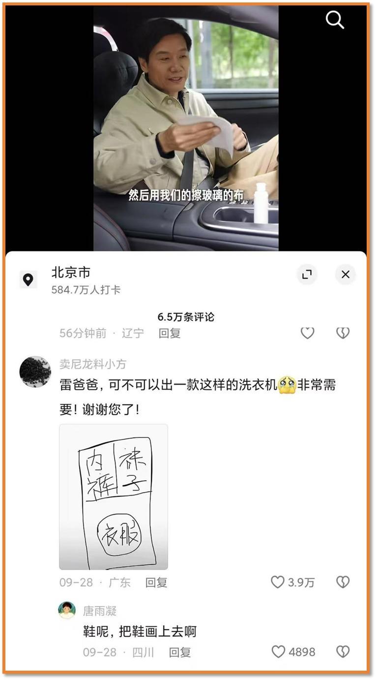 很快,就有网友在雷军的外交账号下,手绘了一张肤浅直白的暗示图:一台洗衣机,左边大圆圈标注“穿着”,右边小圆圈标注“内裤袜子”,配文直言“雷总,能不行造这个?”。