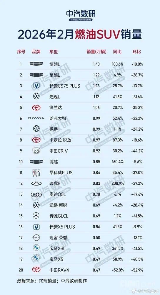 阐明中汽数研发布的榜单,2月燃油SUV销量前三名均为自主品牌:
