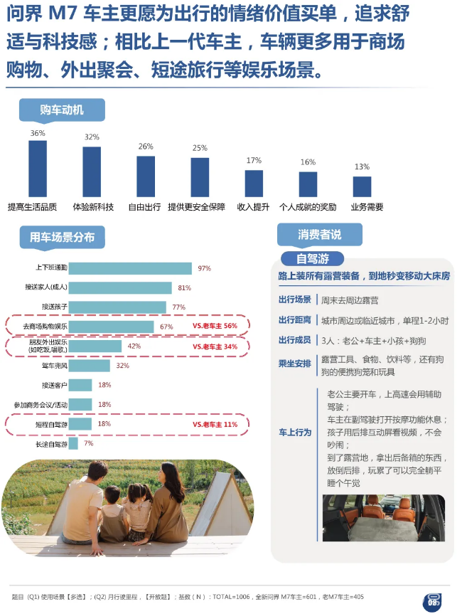 《叙述》说起的另一个重心也不行淡薄——全新问界M7车主的用车场景愈发多元,市场购物、一又友约会、露营野餐、短途自驾成为常态,他们追求用车的情谊价值,渴慕车辆能适配闲适、文娱、家庭出行的各种需求。