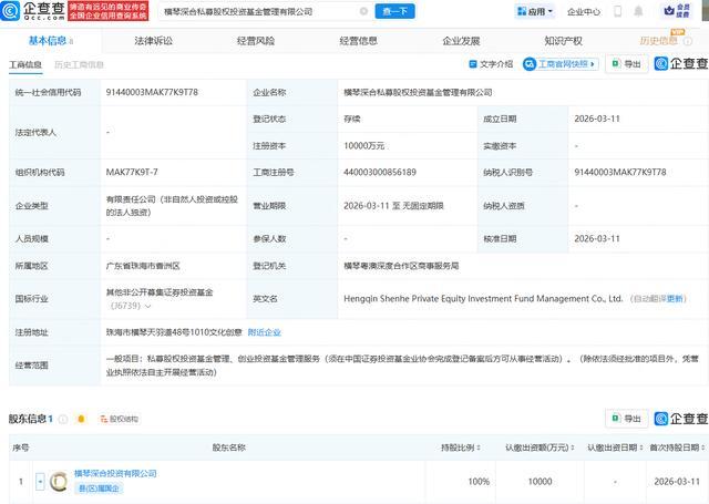 企查查APP清楚,近日,横琴深合私募股权投资基金处置有限公司配置,AG庄闲游戏官网首页开云kaiyun(中国)注册成本为1亿元,策动限度包含:私募股权投资基金处置、创业投资基金处置行状。企查查股权穿透清楚,该公司由横琴深合投资有限公司全资合手股。