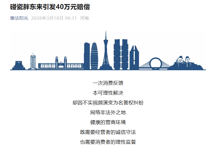3月18日,河南省高档东谈主民法院初次线路该案办理坚信,法院审理认定,阔绰者段某的言论超出刚直监督畛域,组成对企业名誉权的侵害,判决其补偿胖东来商贸集团有限公司40万元,并限期在其抖音账号发布经法院审查的谈歉视频。