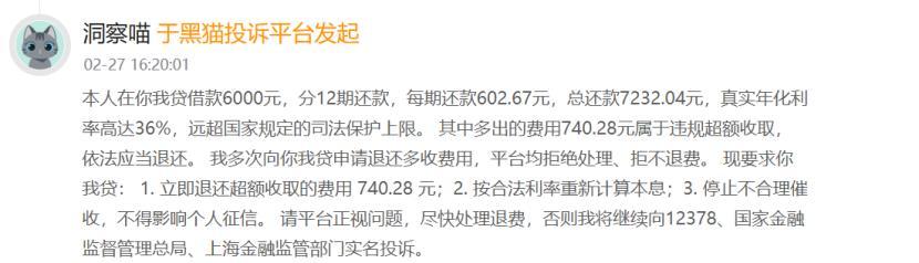 在黑猫投诉平台上,有用户反应,借债6000元,分12期还款,每期还款602.67元,总还款7232.04元,着实年化利率高达36%,远超国度限定的法令保护上限。