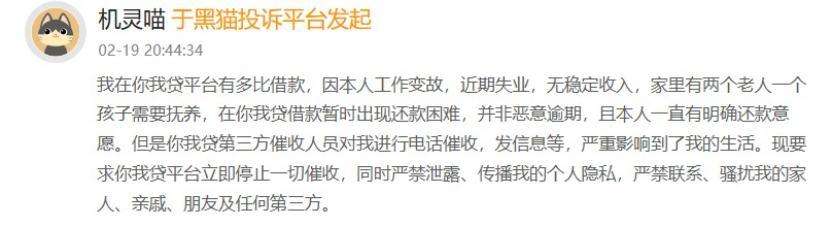 但从黑猫投诉上的诸多信息来看,上述告知发布以后,你我贷或者其相助的催收东谈主员依旧存在暴力催收步履。