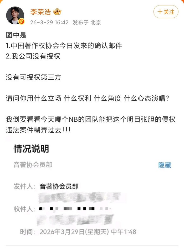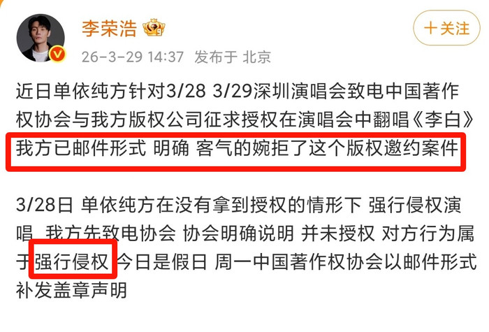 文中称,此前单依纯方针对3月28日、3月29日深圳演唱会致电中国音乐著述权协会与李荣浩方版权公司,征求授权在演唱会中翻唱《李白》,李荣浩方已以邮件神色明确拒却授权,“协会明确讲明并未授权,对方行为属于强行侵权”。