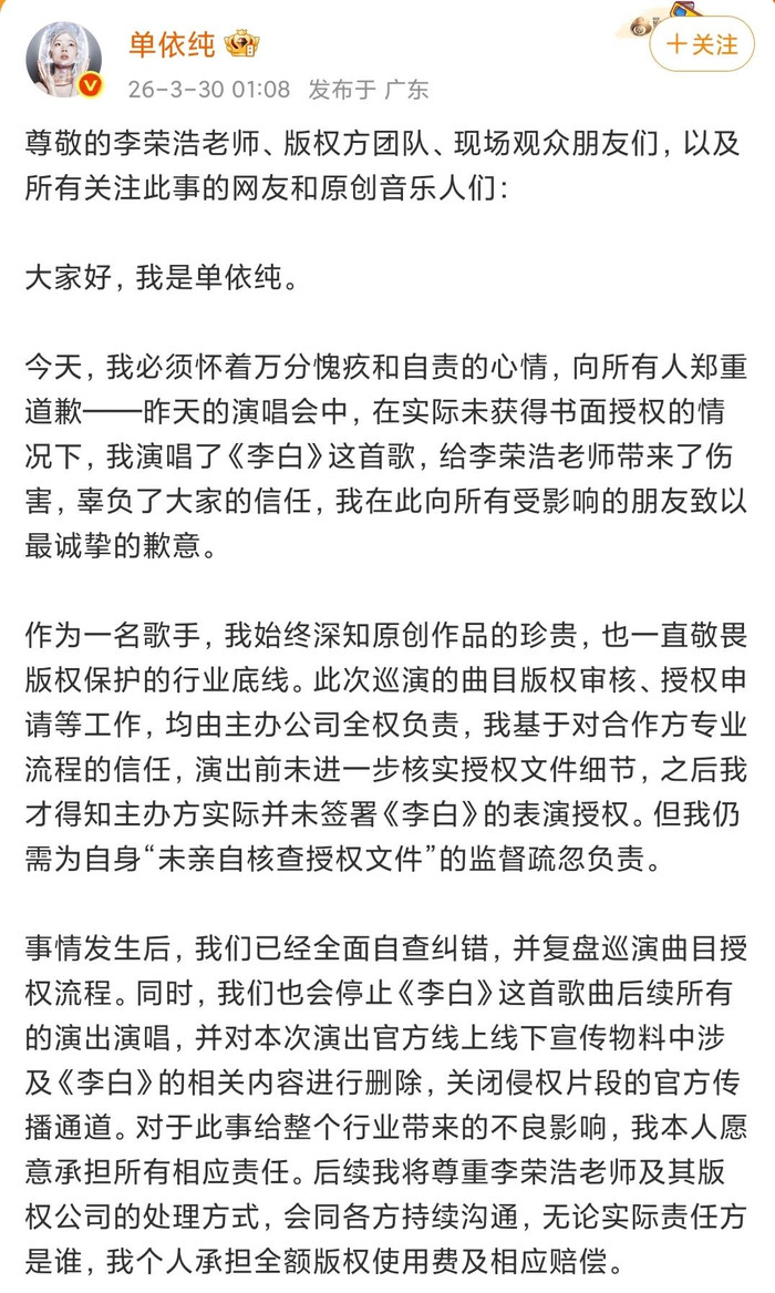 3月30日凌晨,单依纯发长文回复并再次致歉。她解释称,“这次巡演的曲目版权审核、授权肯求等责任,均由支配公司全权厚爱”,我方基于对协作方的信任未进一步核实授权细节,过后才得知支配方并未签署该曲的饰演授权。单依纯还默示,事情发生后已全面自查纠错,并复盘巡演曲目授权历程,同期也会罢手《李白》这首歌曲后续所有的献技演唱,并对本次献技官方线上线下宣传物料中波及《李白》的有关内容进行删除,关闭侵权片断的官方传播通谈。“岂论实践牵扯方是谁,我个东谈主承担全额版权使用费及相应补偿。”