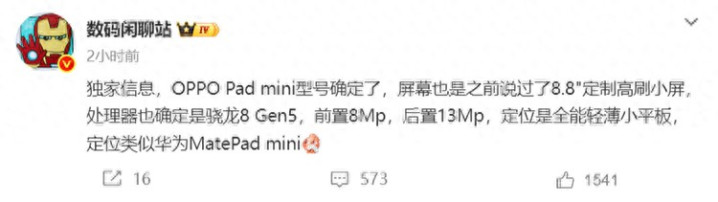 凭证爆料,OPPO Pad mini将配备一块8.8英寸定制高刷屏,中枢搭载高通骁龙8 Gen 5惩办器,影像部分接受800万像素前摄+1300万像素后摄的组合。